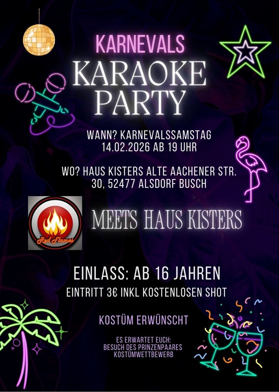 | 19.00 Uhr | Karnevals-Karaoke-Party | KG Buschher Jonge | Haus Kisters, Alte Aachhenerstr. 30 | ||