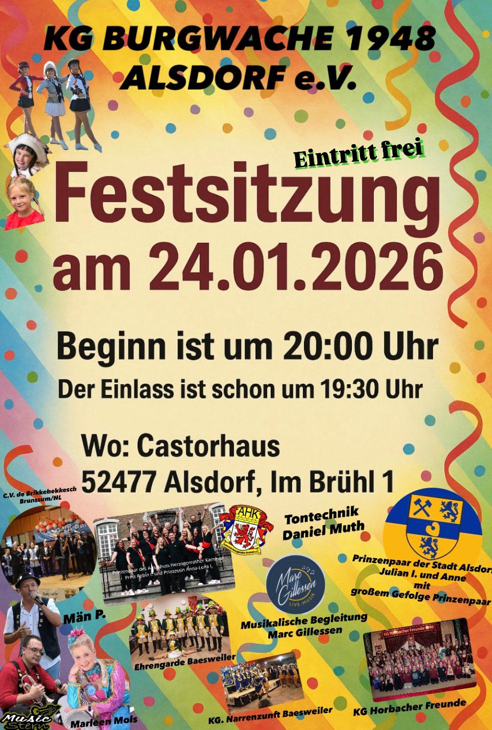| 20.00 Uhr | Festsitzung | KG Burgwache | Castorhaus, Im Brühl 1, Alsdorf | ||