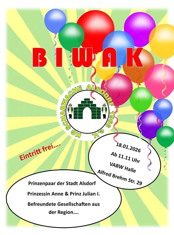 | Sonntag | 18.01.26 | 11.00 Uhr | Biwak | KG Buscher Jonge | Castorhaus, Im Brühl 1 |