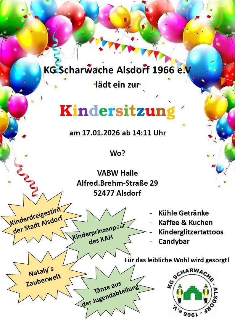 | 14.11 Uhr | Kindersitzung | KG Scharwache | VabW-Halle, Alfred-Brehm-Str. 29, Ofden | ||